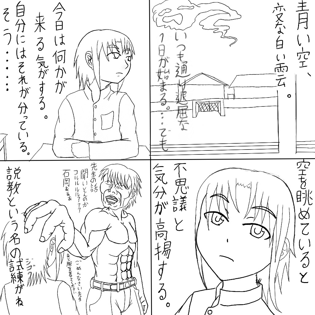 4コマ目の上半身裸の人は一応先生という設定です。
